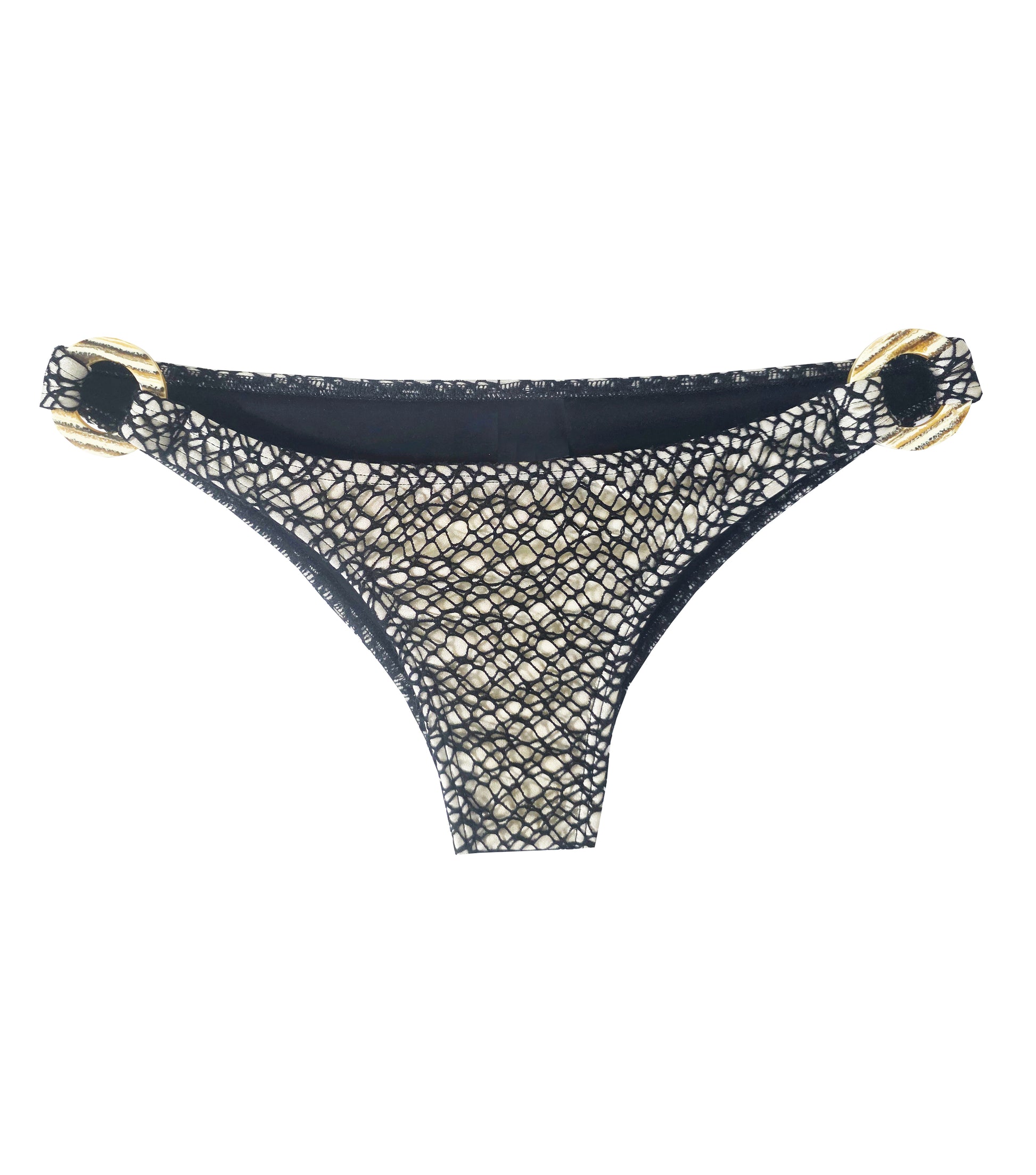 Crafted from luxurious shiny fabric in a subtle nude shade, this bikini bottom features a distinctive spiderweb mesh overlay for an eye-catching appeal. Elegant hoop accents at the hips in natural tones, enhancing its refined design. Fully lined for comfort, it offers a low-rise silhouette with medium cheek coverage, balancing style and sophistication effortlessly.
